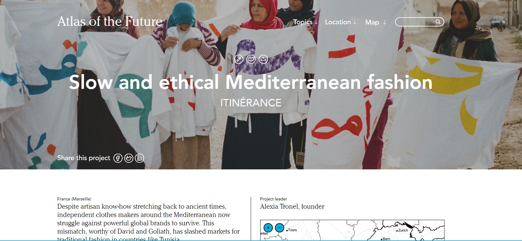 Le premier Switcher à être publié dans le projet Atlas du futur est Itinérance, une association française qui croit en une mode lente et éthique. Elle identifie les communautés d’artisans, les aide à concevoir une gamme de vêtements à diffusion limitée et leur donne accès à de nouveaux marchés. Au cours de ses deux premières années, ITINÉRANCE a autonomisé des travailleuses du textile en Grèce et en Tunisie. Vous pouvez voir leur histoire Atlas ici: https://atlasofthefuture.org/project/itinerance/